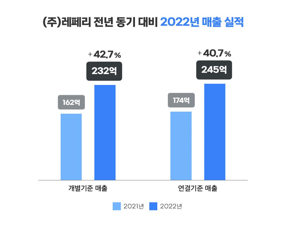 레페리는 지난해 개별기준 매출 232억원, 연결기준 매출 245억원을 달성했다고 밝혔다. 개별기준 매출 232억원은 전년 동기 대비 42.7% 상승한 수치며 영업이익은 전년 동기 대비 135.9%가 상승했다. 연결기준 매출 245억 원은 전년 동기 대비 40.7%가 상승한 수치며 영업이익은 전년 동기 대비 419.7%가 상승했다.