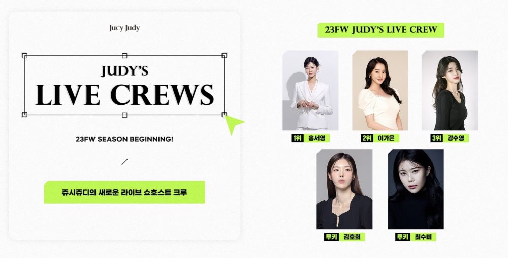‘쥬시쥬디’는 예상보다 재능 있는 인재가 많이 지원해 기존 계획이었던 3명이 아닌 총 5명의 쥬디스 라이브 크루를 선발했다. 최종1, 2, 3위에 오른 3인과 추가 선발된 루키 크루 2인, 총 5인의 쥬디스 라이브 크루가 23 FW 시즌부터 브랜드 알리기에 나설 예정이다.