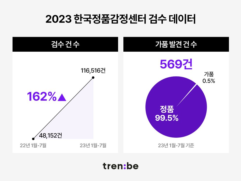 또 한국정품감정센터는 지난 1월부터 7월까지 명품 브랜드 검수 건수가 116,515건으로 전년 동기 대비 약 162% 증가했고 검수를 통해 569개(약 0.5%)의 가품을 걸러냈다고 밝혔다.