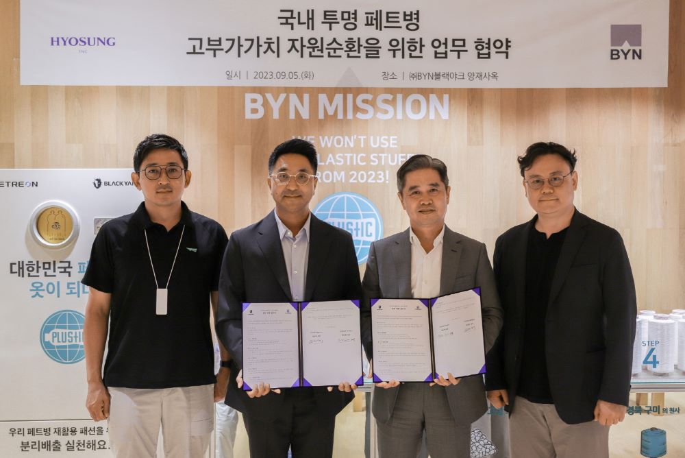 BYN블랙야크그룹(회장 강태선)이 자사의 투명 페트병 자원 순환 시스템 확대를 위해 효성티앤씨와 업무 협약을 체결했다.