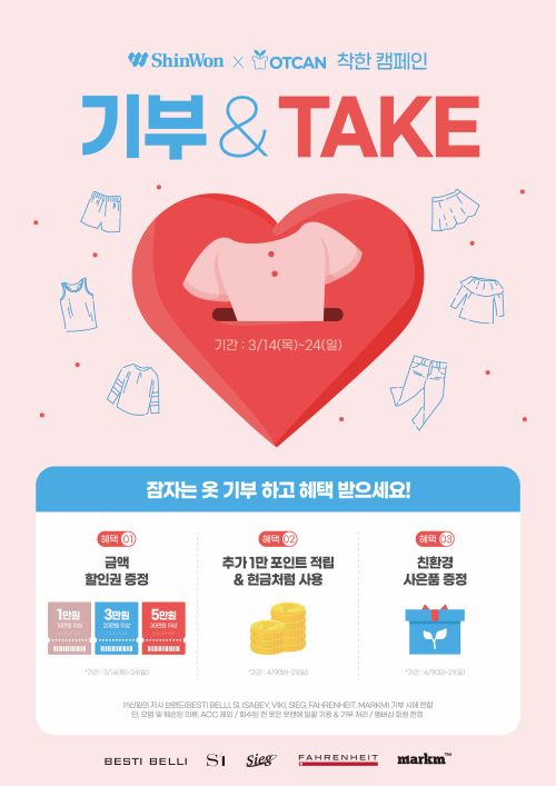 신원이 의류 나눔 비영리 단체 옷캔(OTCAN)과 함께 14일부터 24일까지 11일간 고객 참여형 헌 옷 기부 캠페인 ‘기부 & TAKE’를 진행한다.