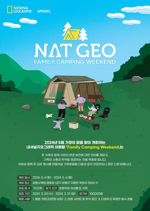 이번 ‘내셔널지오그래픽 패밀리 캠핑 위크엔드’는 5월 4일부터 6일까지 2박 3일간 양평 수목원 오토캠핑장에서 70가족을 대상으로 진행된다.