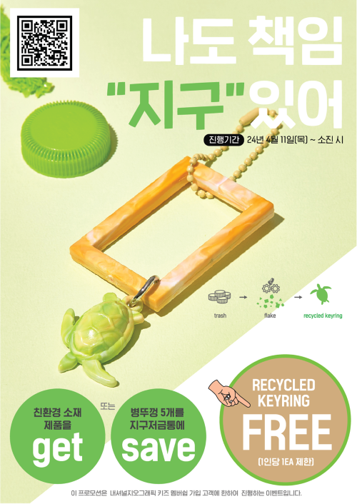 ‘나도 책임 지구 있어’ 캠페인 기간 동안 ‘내셔널지오그래픽 키즈’ 온/오프라인 매장에서 친환경 소재 제품을 구매한 고객에게는 업사이클링 방식으로 만든 바다거북 키링이 제공된다. 오프라인 매장에서는 ‘내셔널지오그래픽 키즈’ 매장 내 비치된 ‘지구 저금통’에 페트병 뚜껑 5개를 저금해도 참여가 가능하다.