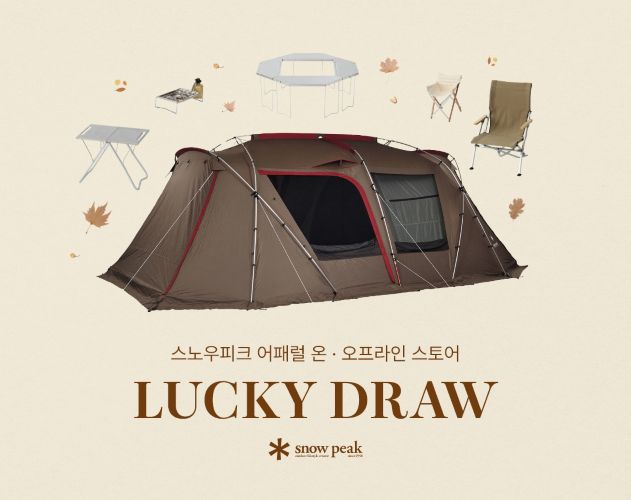 전국 오프라인 매장에서는 15만원 이상 구매 고객에게 스크래치 쿠폰 최대 5매를 증정하며 현장에서 즉시 당첨 결과를 확인할 수 있다. 경품으로는 최대 400만원 상당의 캠핑 세트, 100만원에서 1만원 상당의 상품교환권, ‘스노우피크’ 시그니처 키링 등 다양한 상품이 마련되어 있으며 고객들은 현장에서 직접 당첨의 즐거움을 누릴 수 있다.