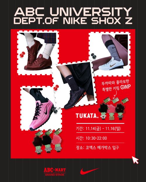 나이키 ‘샥스 Z’ 구매 고객을 위한 특별 이벤트도 준비했다. 현장에서 ‘샥스 Z’ 구매 시 Z세대 사이에서 큰 인기를 끌고 있는 라이프스타일 브랜드 ‘뚜까따’와 협업한 ‘ABC마트 X 나이키’ 한정판 캐릭터 키링을 증정한다. ABC마트 그랜드 스테이지와 ‘샥스 Z’를 재해석한 컬러웨이가 돋보이며 의상과 헤어를 자유롭게 커스터마이징 가능하다.