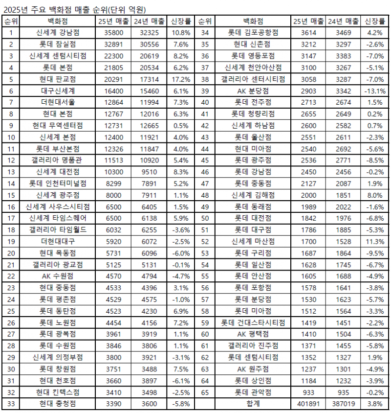업계에 의하면 지난해 국내 주요 65개 백화점의 전체 매출은 40조1891억원으로 전년 대비 3.8% 상승했다. 전반적으로 매출은 늘었지만 지역 불균형이 뚜렷하게 나타나며 빈익빈부익부 현상이 더욱 심화됐다.