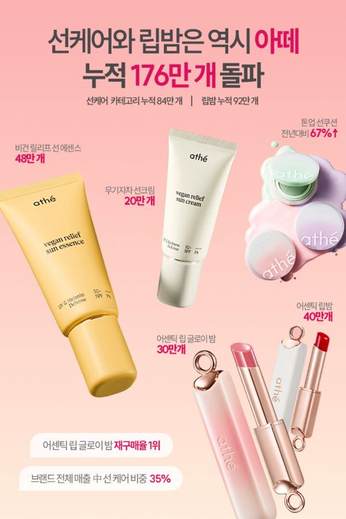 특히 ‘아떼’는 자외선 차단제를 스킨케어처럼 사용하는 ‘선 에센스’ 카테고리를 제안하며 현재까지 총 약 48만개가 판매됐다. 대표 제품인 ‘비건 릴리프 선 에센스’는 스킨케어링 성분을 71% 함유해 민감 피부도 부담 없이 사용할 수 있으며 자연스러운 윤기를 더하는 ‘여배우 화잘먹 선에센스’로 입소문을 타고 있다.