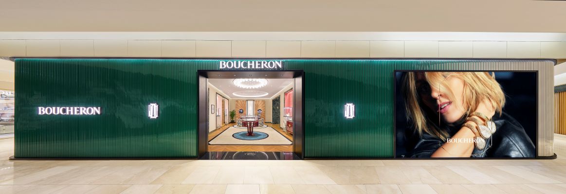 새로운 부티크의 파사드는 녹색 톤의 금속과 미러 프리즘이 조합되어 보석의 다각면처럼 끊임없이 변주되는 빛의 반사를 만들어내며 메종의 아이콘인 그로그랭 디테일과 시그니처 그린 컬러를 현대적으로 표현한다. 파사드에 설치된 두 개의 윈도우 디스플레이에는 부쉐론의 시그니처 아이콘을 보여주며 고객의 시선을 사로잡고 내부 인테리어에는 블랙 몰딩 프레임과 세련된 메탈 터치, 균형감 있는 구조가 더해져 부쉐론 특유의 미학을 완성한다.