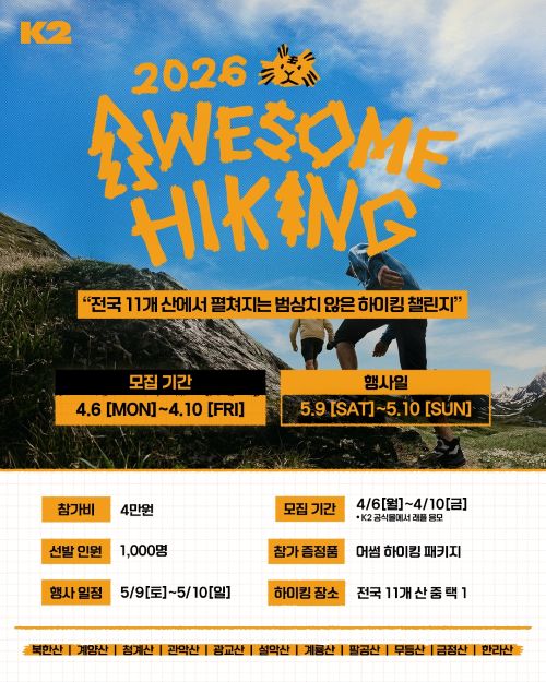 올해로 7회째를 맞은 ‘2026 K2 어썸하이킹’은 오는 5월 9일부터 10일까지 양일간 진행되며 참가자는 기간 내 자율적으로 하이킹에 참여하면 된다. 하이킹 장소는 북한산, 계양산, 청계산, 관악산, 광교산, 설악산, 계룡산, 팔공산, 금정산, 무등산, 한라산 등 전국 11개 산 중 한 곳을 선택할 수 있다.