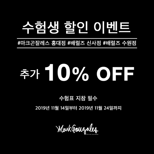 ‘마크곤잘레스’ 홍대점과 ‘배럴즈’ 신사점, 수원점 등 오프라인에서 수험생에게 10% 추가 할인 혜택을 제공하는 것. 또 ‘마크곤잘레스’의 이번 시즌 스팟 상품인 플리스 자켓을 비롯해 시즌 인기 아이템을 할인 가격에 구매할 수 있다.