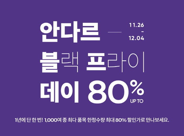 안다르(대표 신애련)가 1,000여종의 품목을 최대 80% 할인된 가격으로 만나볼 수 있는 역대급 이벤트 ‘안다르 80% 블프데이’를 오늘(26일) 오전 10시부터 다음주 수요일(12월 4일)까지 진행한다.