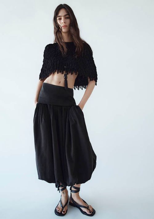 이번 컬렉션의 핵심은 화려한 자수와 대담한 크로셰가 장식된 프린지 장식 상의, 반투명 긴 드레스 및 베스트, 그리고 디테일이 살아있는 블라우스다.