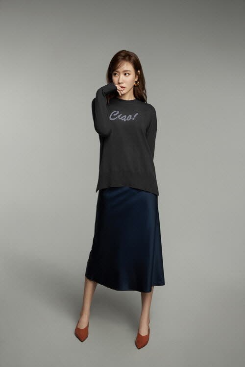 클래식한 네이비 컬러의 트렌치코트를 활용해 페미닌하면서도 모던한 무드를 제안하고 브라운 컬러의 셔츠로 완연한 가을 분위기에 녹아든 모습을 보여주었다.