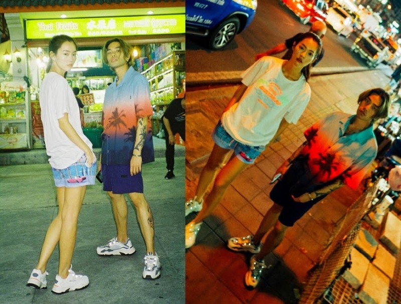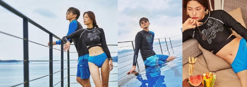 무더운 날씨에 물놀이를 준비하고 있는 커플에게 비슷한 색감과 트로피컬 로고로 포인트를 준 래쉬가드를 추천한다. 남성용 뉴빅로고 래쉬가드와 여성용 절개형 빅로고 크롭탑은 가슴부분의 스포티한 레터링 프린트 디자인이 특징으로 청량한 파란 색감의 컬러블록 팬츠와 비키니 하의를 매치하면 심플하면서도 트렌디한 래쉬가드 커플룩 연출이 가능하다.