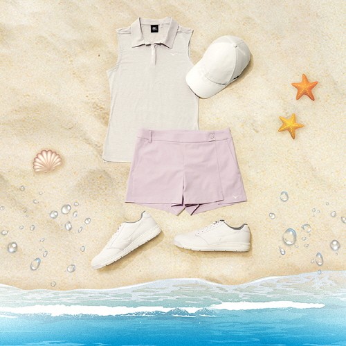 쿨 탑 티셔츠와 셋업 해서 입기 좋은 썸머 쇼츠도 골캉스를 위한 필수 아이템이다. 미니멀한 실루엣에 옆 지퍼를 활용해 라인이 깨끗하게 떨어지며 왼쪽 하단의 기장을 언밸런스로 연출한 디테일도 눈에 띈다. 신축성이 뛰어나 여유롭고 편안하게 몸에 피트 되며 라벤더와 블랙 컬러로 만날 볼 수 있다.