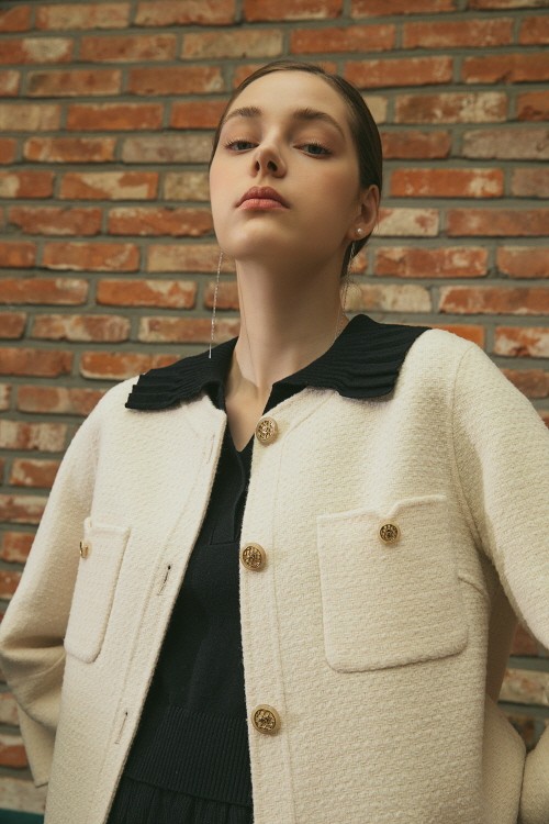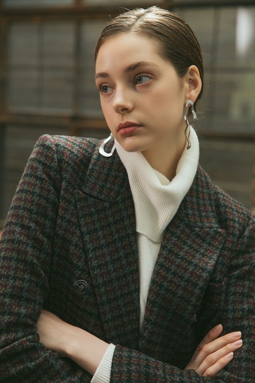 또 금장 단추 디테일로 럭셔리 무드를 살린 자주색 원피스와 체크 패턴이 돋보이는 베이지 컬러 핸드메이드 코트를 매치한 것도 눈에 띈다. 화이트 트위드 소재 핸드메이드 재킷에 블랙 이너로 트렌디한 스타일링을 쉽게 연출할 수 있도록 선보였다. 얼굴을 작아 보이게 하는 빅 라펠이 적용된 어두운 톤의 하운즈투스 패턴 재킷은 누구나 쉽게 매치하기 좋은 아이템이다.