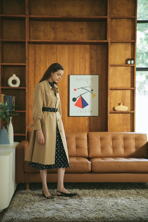화보 속 모델은 씨의 시그니처 레터링 패턴으로 포인트를 준 모크넥 원피스에 가을 머스트 해브 아이템인 볼륨소매의 트렌치코트를 매치해 여성스러운 무드를 연출하면서 볼드한 블랙 레더 벨트로 트렌드를 가미했다.