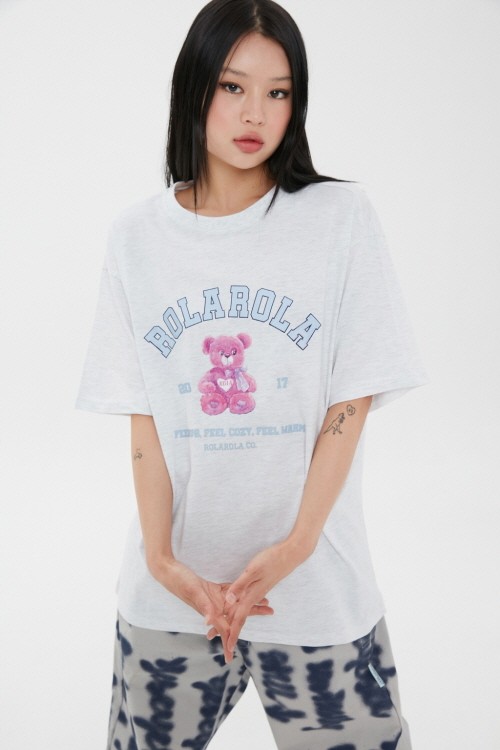 기본이 되는 화이트 함께 멜란지그레이, 차콜, 타이다이 등 티셔츠 컬러에 따라 로라베어도 함께 컬러에 변화를 주어 고객들의 다양한 취향에 맞게 제안 하였으며 특히 클래식한 폰트를 사용하여 중앙에 아치형태로 배치한 로고와 멜란지 소재를 사용한 디자인은 현재 가장 트렌드로 떠오른 레트로 캠퍼스룩을 연출하기 제격이다.