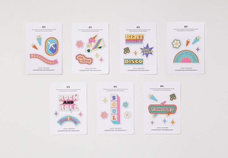‘BTS X 제이미원더컬렉션에는 미니멀한 가방 외에도 에코백키링러기지 참가죽 스티커 등 제품을 선보인다특히 가죽 스티커는 ‘Dynamite’의 가사를 다양한 모양과 단어로 풀어내었는데 이는 가방에 DIY로 꾸밀 수 있어 자신만의 개성을 나타낼 수 있다는 것이 또 하나의 재미 요소이다.