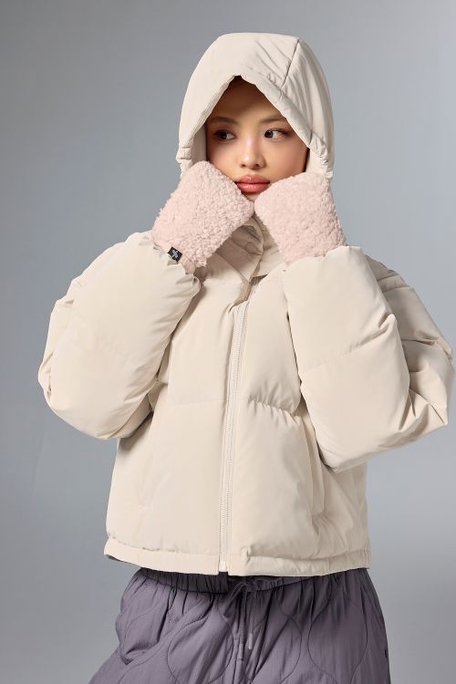 크롭 점퍼와 바라클라바에는 은은한 광택으로 고급스러우면서도 세련된 분위기를 자아내는 글로시한 소재에 보온 효과를 더했다.