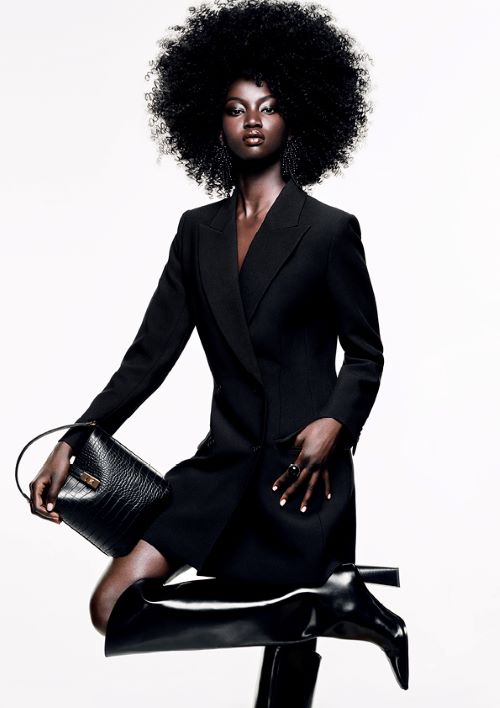 인조 레더와 데님이 섞인 낭만적이고 화려한 실루엣은 파워 숄더, 좁은 허리 디자인, 가늘고 긴 라인의 스트롱 수트, 롱 드레스, 탑에서 보여진다.