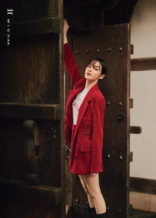화보 속 홍수주는 언발란스 포켓과 탈부착 가능한 와펜이 달린 레드 컬러 코듀로이 소재 셋업을 멋스럽게 입거나 은은한 메탈 소재의 고급스럽고 우아한 매력이 담긴 원피스를 매치하여 그녀만의 단아하고 고급스러운 무드로 완벽 소화했다.