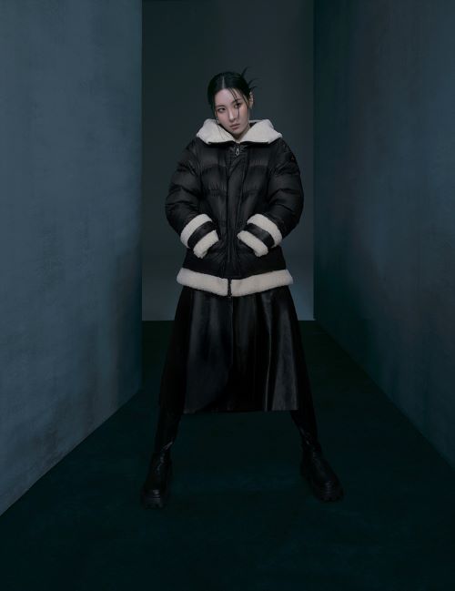 선미가 레더 소재의 플레어 스커트와 롱부츠와 함께 매치한 쿤토 숏 다운 패딩은 지난 시즌 출시와 동시에 완판 행진을 이룬 페트레이의 대표 캐리오버 아이템이다.