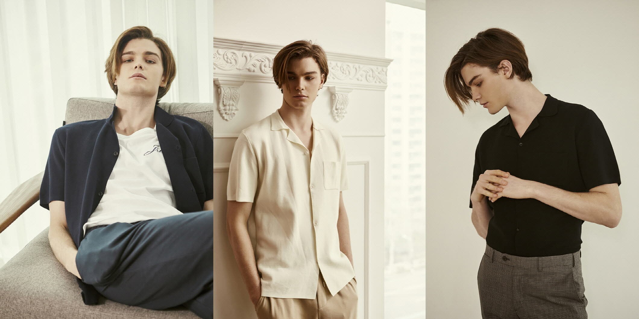 캐주얼한 스트링 팬츠와 티셔츠를 매치해 가벼운 아우터로 활용해, 바캉스에서도 어떤 스타일링을 완성 할 수 있고 자연스럽게 칼라가 벌어지는 오픈 칼라 셔츠로 연출해 슬렉스, 코튼 팬츠 등으로 지적인 쿨 비즈 룩을 완성할 수 있다