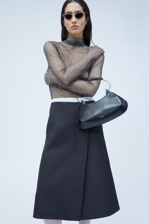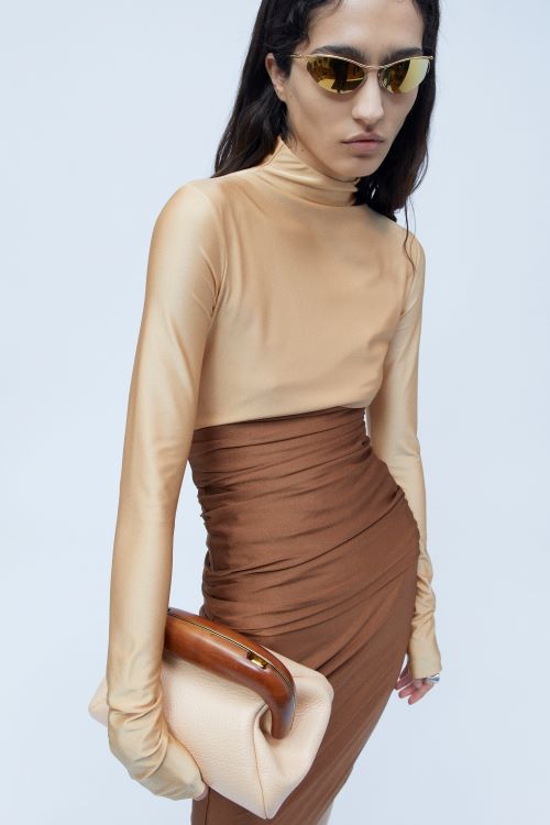 또한 얇은 메시 드레스에서는 90년대 미니멀리즘을 느낄 수 있다. 반짝이는 라인스톤으로 장식된 드레스는 블랙 컬러부터 핑크 컬러까지 차분한 룩에 화려한 터치를 더하며 라이크라 원단을 사용해 몸의 라인이 과감하게 드러나는 것이 특징이다.