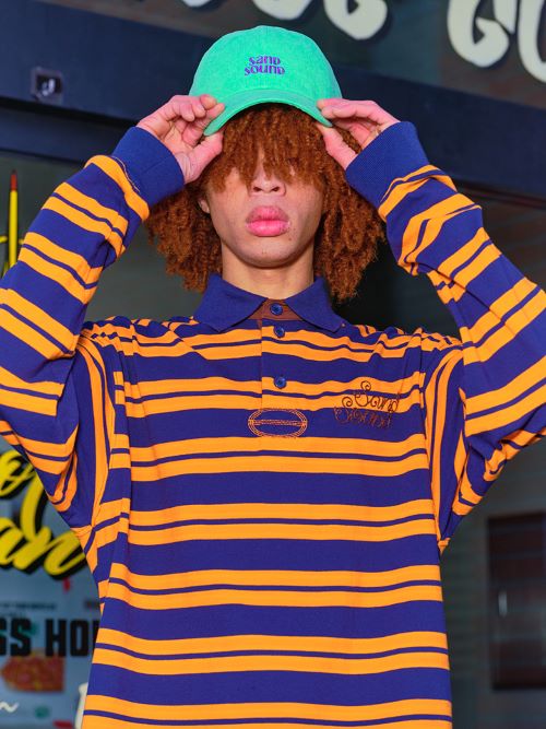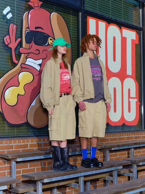 ‘샌드사운드’는 폴로 칼라 스트라이프 패턴 상의를 활용한 룩과 베이지 컬러의 블루종/치노 쇼츠 셋업 등을 대표 룩으로 제안했다. 미국 내 멕시코인을 의미하는 치카노가 즐겨 입던 스타일을 기반으로 여유로운 핏과 자유분방한 감성이 특징이다. 뉴멕시코 현지 실사 그래픽이 더해진 셔츠나 시스루 소재 상의 등 위트 있는 상품도 선보였다.