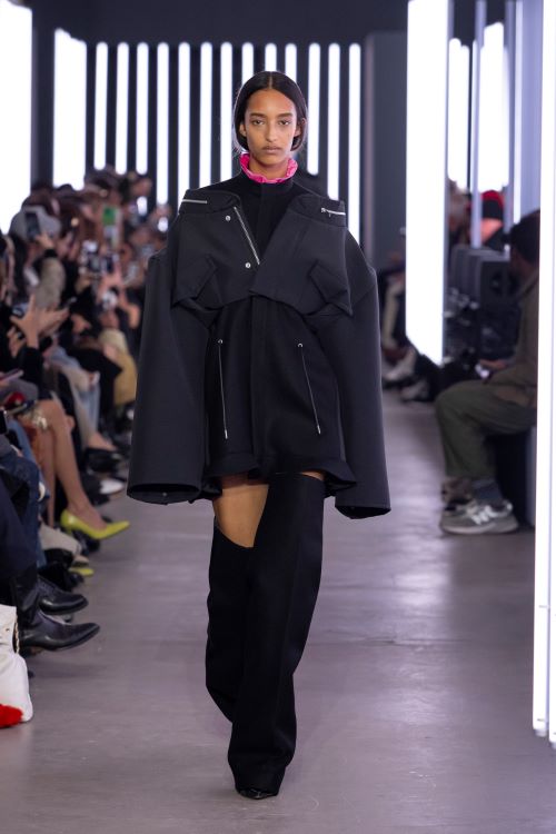 이러한 개념은 정면에서 보았을 때 바지로 보이는 롱 부츠까지 연장되었다. 실루엣은 재정의되고 완벽해져 모든 앵글에서 놀라운데, 정면의 플라이트 자켓 + 볼륨 있는 수트 자켓의 소매 + 후면의 퀼팅의 조합으로 봄버 자켓을 페플럼 자켓으로 융합시켰다.