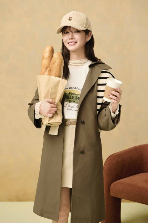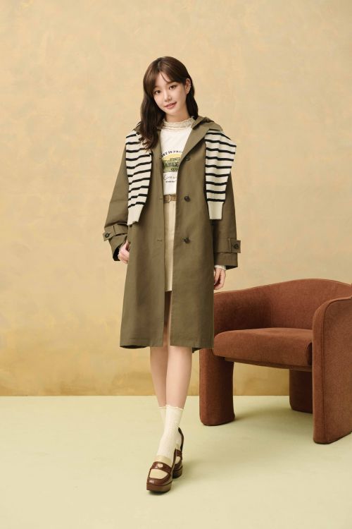 두 번째 화보에서는 탈부착 가능한 후드 디자인의 트렌치 코트에 아이보리 레터링 티셔츠, 미니 스커트를 매치하고 스트라이프 니트톱을 어깨에 걸쳐 포인트를 더해 활동적이면서도 감각적인 가을 캐주얼 룩을 연출했다.