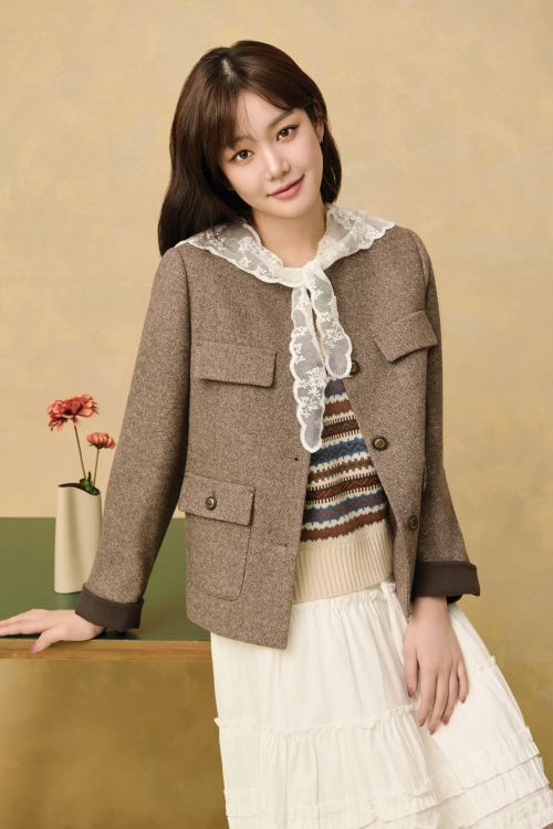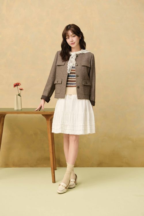첫 번째 화보에서는 브라운 컬러의 포켓 라운드 울자켓에 브이넥 배색 니트 베스트와 화이트 플레어 미디 스커트를 매치해 페미닌하면서도 계절의 감성을 한층 살린 가을 스타일링을 선보였다.