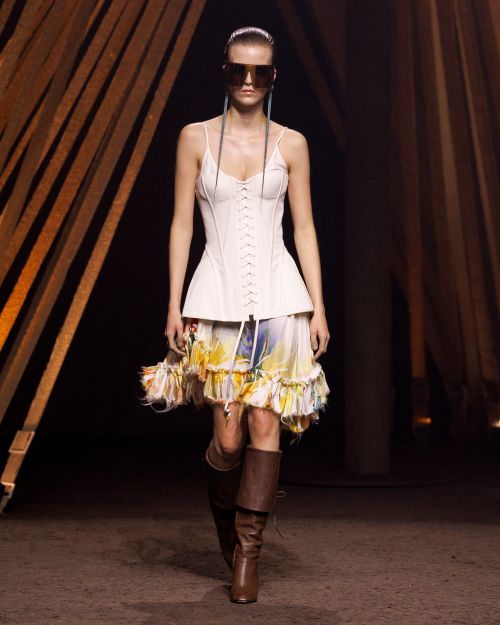 코르셋 디테일은 전통에서 해방되어 자카르 드레스와 부츠에 자유롭게 적용되었고 추상화된 곤충 프린트는 실크 패러슈트 가운에 불꽃 장식과 스프레이 페인트 데그라데 효과는 드레스에 더해져 강렬한 룩을 완성했다.