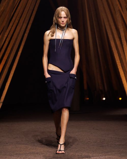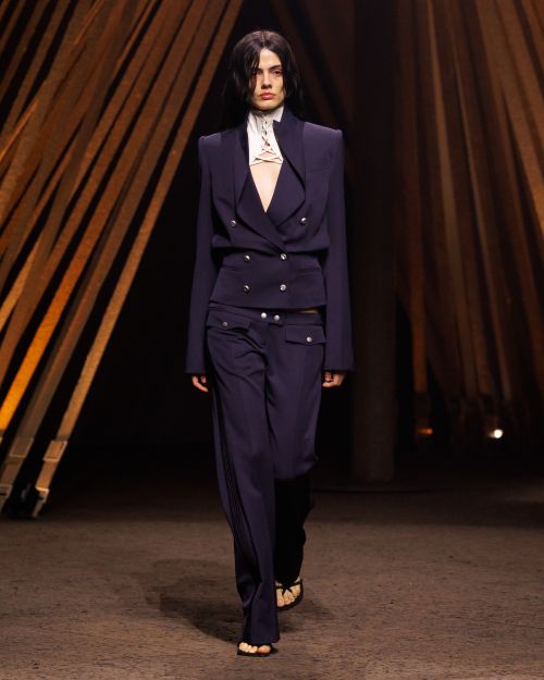 재킷은 여러 형태로 재해석되어 ‘맥퀸’ 특유의 정교한 테일러링을 현대적이고 스트리트 시선으로 확장했다. 기존 구조를 벗어난 포켓 절개 디자인, 제복 소재와 마감 디테일의 절개된 뷔스티에 드레스 등 모든 실루엣은 하우스의 기술적인 테일러링 유산에 뿌리를 두었다.