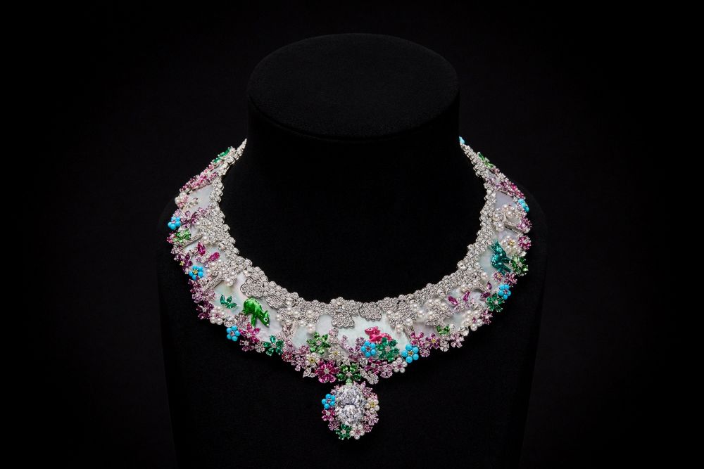 마더 오브 펄을 배경으로 다이아몬드, 진주, 젬스톤이 조화롭게 세공된 이 네크리스는 자연의 아름다움과 빛의 리듬을 섬세하고 또 다채로운 컬러의 유희를 표현하며 ‘디올’만의 예술적 감성을 드러낸다.