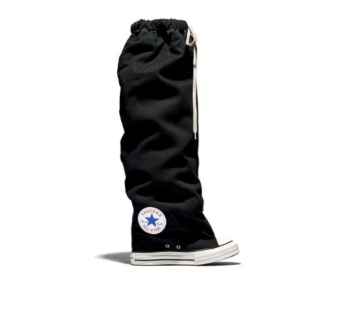 ‘컨버스X 바케라’ 슬라우치 웨지는 종아리 높이의 엑스하이 슬라우치 웨지(와 무릎 높이까지 오는 트리플 엑스하이슬라우치 웨지 두 가지 버전으로 선보인다. 루즈한 오버사이즈 실루엣에 탑 레이스와 신축성 있는 밴딩 스트랩 디테일이 더해져 다양한 스타일링이 가능하다. 왁스 처리된 캔버스 어퍼와 내부 첼시 웨지 인솔은 안정적인 착화감을 제공하며 좌측 안쪽의 커스텀 바케라 디보스 앵클 패치와 좌측 힐 라이선스 플레이트는 협업의 상징성을 보여준다.