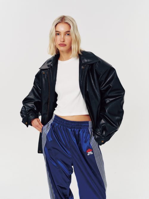 은은한 광택감이 돋보이는 ‘빈티지 워시드 페이크 레더 자켓’은 루즈하고 볼륨감 있는 실루엣, 드롭된 숄더 라인과 볼드한 카라 디자인으로 레트로하면서도 스트리트한 무드를 선사한다. 전체적으로 여유로운 실루엣이지만 밴딩 처리된 밑단과 소매단으로 안정감 있는 착용감을 제공하며 내부에는 퀼팅 안감을 더해 보온성과 착용감을 한층 높였다.