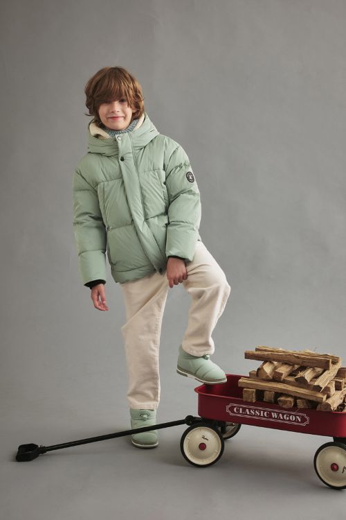 또한 남아 화보 속 패딩 점퍼는 가볍고 볼륨감 있는 핏으로 포근한 분위기를 완성하며 생활 방수 기능과 여유로운 사이즈 구성으로 활동적인 아이들의 겨울 일상에 최적화 되었다.