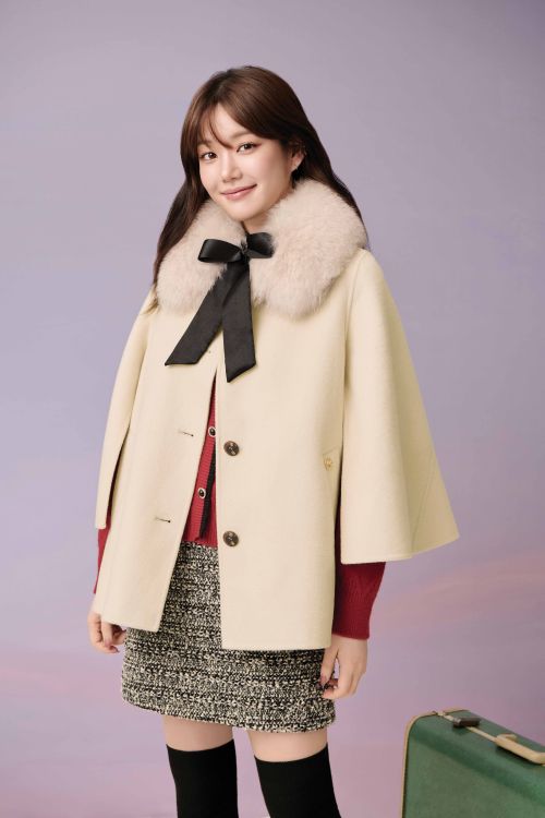 또 멜란지 그레이 컬러의 스탠카라 롱코트에 보카시 원단의 컬러 니트와 아이보리 팬츠, 베레모를 매치해 부드럽고 감성적인 겨울 롱코트룩을 선보였다.