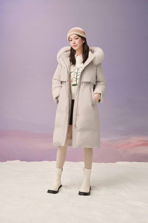 허리선 스트링 포인트로 실루엣을 살린 라이트 베이지 컬러의 롱다운 패딩에 아이보리 니트와 미니 스커트를 매치해 세련된 스타일을 제안했다.