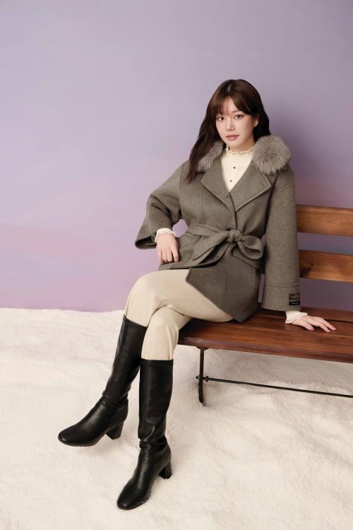 폭스 퍼 디테일의 캐시미어 핸드메이드 하프 코트에 아이보리 니트와 팬츠, 블랙 롱부츠를 매치해 우아하면서도 세련된 겨울룩을 연출했다.