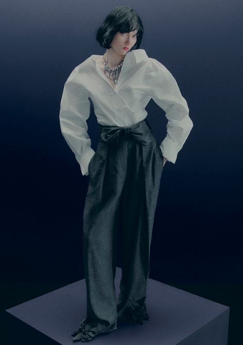 이번 시즌 셔츠는 주요 아이템으로 룩을 완성한다. 클래식한 화이트 턱시도 셔츠는 와이드 오픈 칼라와 컷아웃 숄더 디테일로 재해석되어 시그니처 네크리스와 귀걸이를 돋보이게 하며 화이트 러플 하이칼라 셔츠는 턱시도 비브 프론트와 깊은 커프스로 한층 우아한 분위기를 연출한다.