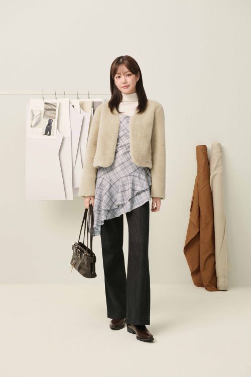 첫 번째 화보에서는 베이지 컬러의 퍼 무스탕 자켓에 체크 프릴 원피스와 블랙 와이드 데님팬츠를 매치해 페미닌하면서도 유니크한 겨울 레이어드룩을 완성했다.