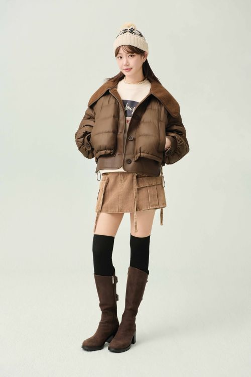 또한 보온성과 퀄리티를 높인 모카 컬러의 알파카 롱코트에 아이보리 컬러의 패턴 니트 베스트와 화이트 플리츠 스커트를 매치해 러블리하면서도 감성적인 겨울 롱코트 스타일링을 선보였으며 브라운 컬러의 덕다운 숏패딩에 아이보리 레터링 맨투맨과 베이지 미니 스커트를 매치해 캐주얼하면서 도 시크한 매력이 돋보이는 겨울룩을 연출했다.