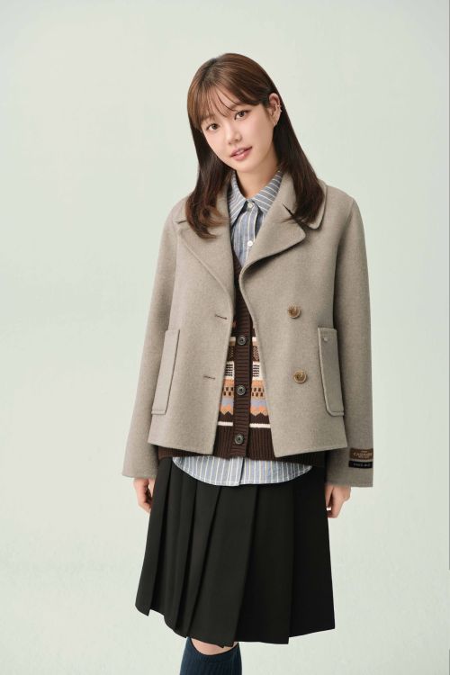 두 번째 화보에서는 라이트 베이지 컬러의 숏자켓에 배색 니트 베스트와 블루 컬러의 스트라이프 셔츠를 레이어드하고 블랙 플리츠 스커트를 매치해 단정하면서도 세련된 겨울 프레피룩을 연출했다.