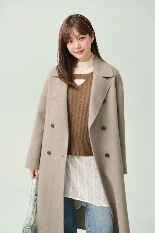마지막으로는 멜란지 베이지 컬러의 루즈핏 핸드메이드 롱코트에 브라운 트임 니트와 화이트 레이스 티셔츠를 레이어링하고 연청 와이드 데님 팬츠를 매치해 감각적인 겨울 데일리룩을 완성했다.