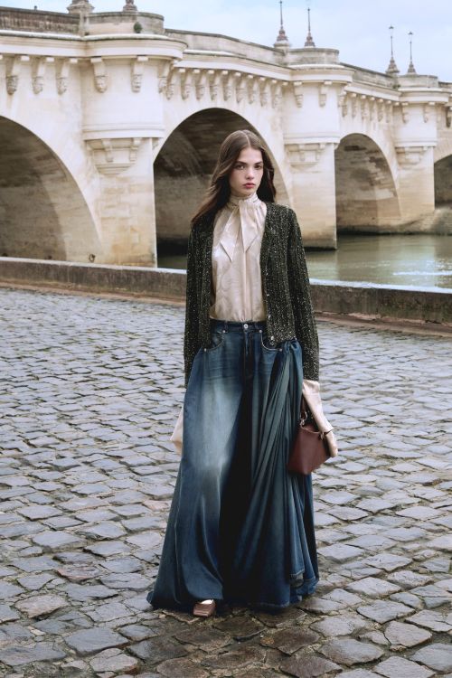 특히 다양한 방식으로 변형하고 활용할 수 있는 룩에 주목할 수 있다. 부드럽거나 크롭된 형태, 혹은 코트 크기로 확장된 Bar 재킷을 비롯해 몸을 감싸는 여유로운 코트, 니트 케이프, 드레이프 드레스, 와이드 실크 데님 팬츠, 측면의 극적인 볼륨이 돋보이는 조각적인 드레스가 컬렉션의 핵심을 이룬다.