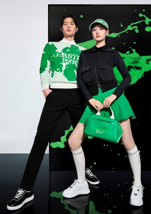 여자 모델은 시크한 올블랙 상의에 채도 높은 그린 플리츠 스커트와 글로시한 로고 토트백을 매치해 경쾌하면서도 강렬한 골프 패션을 연출했다. 특히 입체 포켓 디테일이 돋보이는 집업 베스트는 트렌디한 유틸리티룩을 연상시키며 일교차가 간절기에 다양하게 코디하기 좋다.
