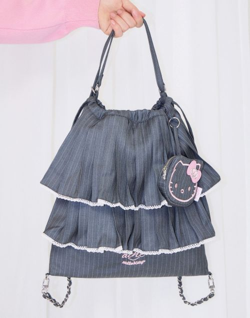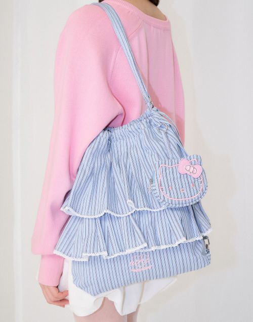 이번 협업에서 프릴백은 편안한 저지 소재와 포멀한 스트라이프 패턴 원단으로 재해석됐다. 저지 소재를 활용한 프릴백에는 빅 사이즈 헬로키티 자수를 적용해 캐주얼한 매력을 강조했다. 반면 광택감이 돋보이는 스트라이프 패턴의 프릴백에는 프릴 끝단에 섬세한 레이스 디테일을 더하고 ‘헬로키티’ 얼굴 모양의 참 장식을 적용해 서로 대비되는 매력을 완성했다.